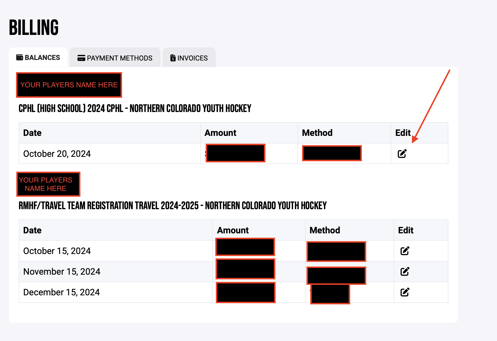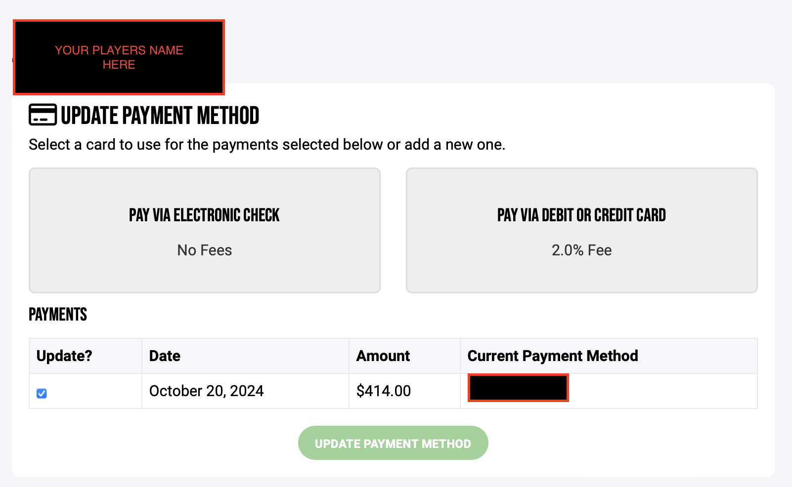 - Click on the player whose payment information needs updated.